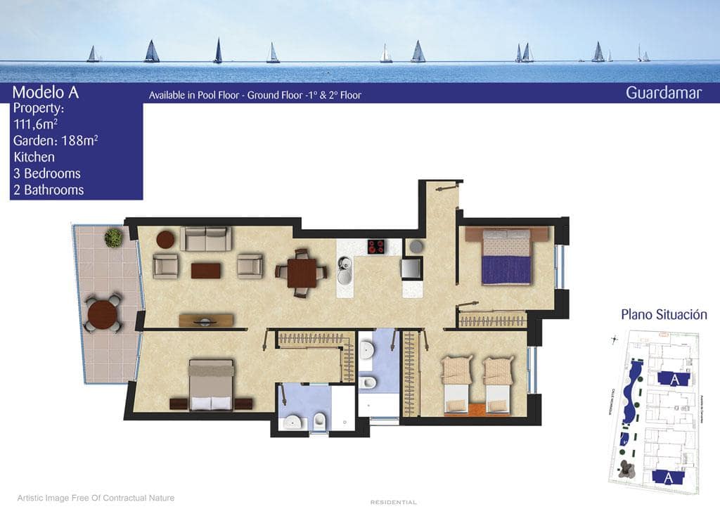 New complex consisting in 43 apartments in 3 blocks. The blocks are composed by ground floor apartments with private garden, midlevels with terraces and top floor units with private solariums. The complex is gated with garden areas, swimming pools and underground parking.