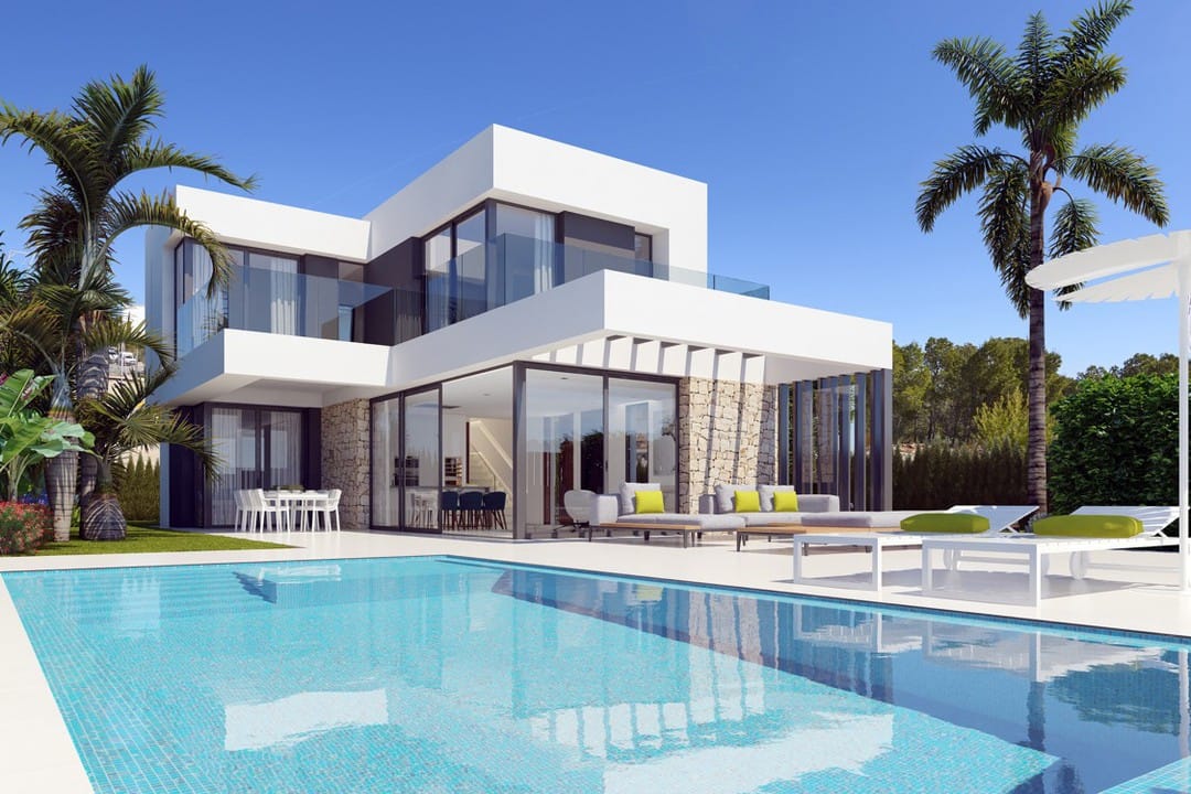 New modern detached villas in Sierra Cortina, Finestrat, that comprise an open plan lounge/kitchen with large glazed doors, 1 bedroom and 1 bathroom on the ground floor; on the top floor the property has 2 bedrooms with 2 en-suite bathrooms, walk in wardrobe in the master bedroom and a large terrace with great views of the sea and Benidorm’s skyline. The houses have a total area of 132 sqm and have the option of adding a basement. Built on plots of approx. 450 sqm with covered terraced areas, private swimming pool, off road parking space and landscaped garden.