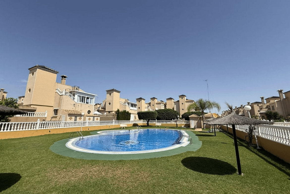 The apartment forms part of a well-maintained residential development with communal gardens and a shared swimming pool. It is conveniently located close to local amenities, golf courses, and within easy driving distance of the coastline.