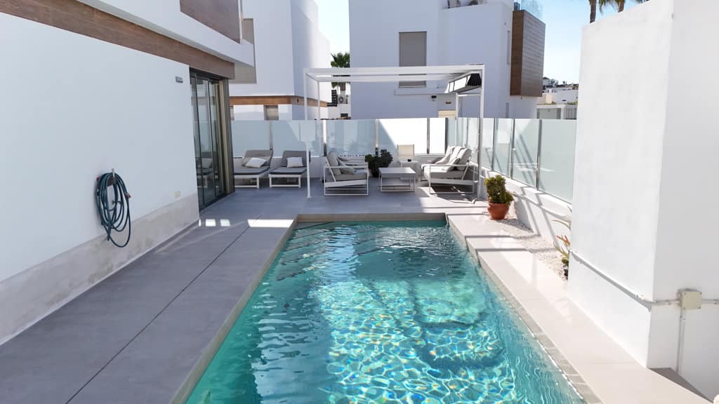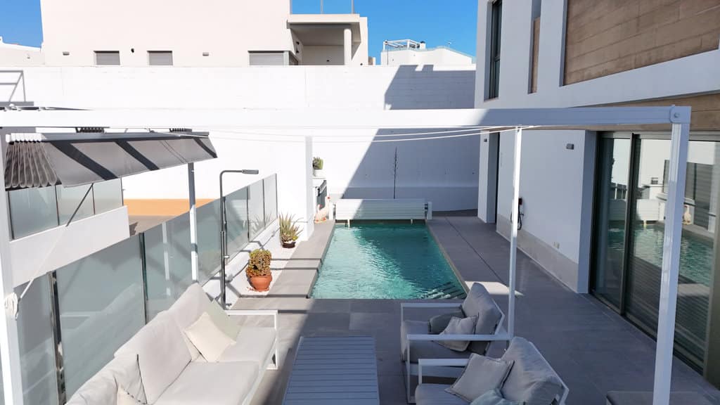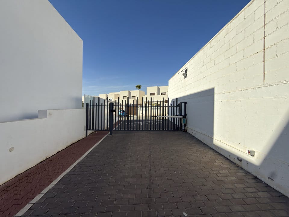 The property sits on an approximately 400 m² plot with a build size of around 200 m². Accessed through the garden, there is private parking space for a vehicle, a private heated swimming pool, and generous terrace areas ideal for outdoor living. In addition, residents benefit from access to a communal swimming pool within the community.