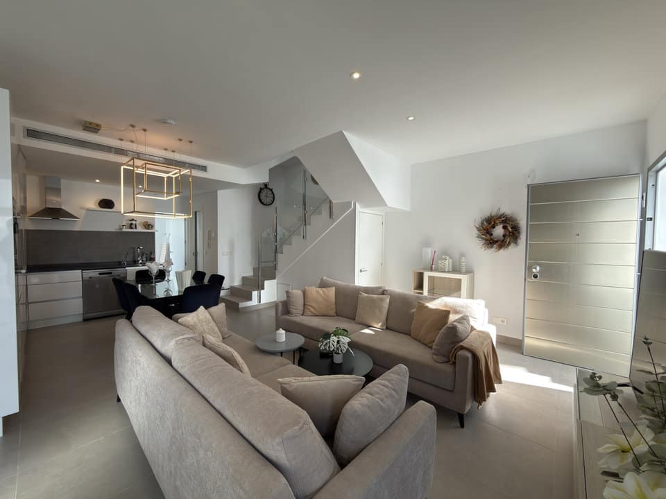 On the ground floor, the villa features a bright open-plan kitchen that flows seamlessly into a spacious lounge, creating an ideal environment for both everyday living and entertaining. There is also a guest bedroom on this level, along with a separate family bathroom that is not en suite.