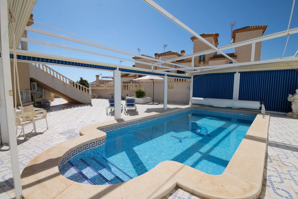 | A very well presented, south west facing detached villa on a large corner plot. It comprises a spacious open-plan layout with a lounge, diner, kitchen, and utility room. There is also the master bedroom with en-suite shower room and separate W.C. Adjacent to the dining area is a large terrace, enclosed on both sides by glass curtains, allowing all to be folded back and enjoy lovely distant sea views from this elevated position. Steps from the terrace lead down to the fabulous pool area. Back in the lounge, the stairs go down to the ground floor, where there is a large storage room, 3 double bedrooms, a shower room, and a separate W.C. A door gives access to the pool area. Outside, this fabulous 500 metres plot has plenty of space to relax and entertain. The swimming pool is heated and has a cover and awnings on the sides and the roof to allow year-round swimming. There are fruit trees also in the garden. To the rear, there is off-road parking and the entrance door to the villa. There are also stairs leading up to the roof solarium, enjoying even better sea views. The villa also benefits from air conditioning, internet, and is to be sold part furnished. It is within walking distance to amenities and only 10 minutes drive to the nearest beaches. This uniquely designed villa is for the first time on the market and is a much-loved second home, which shows throughout the villa. Viewing is highly recommended. No Community fees. SUMA (IBI) 659.12€ |