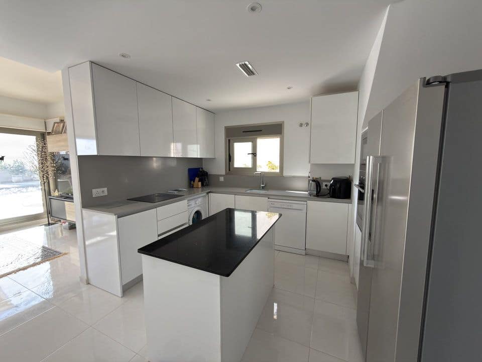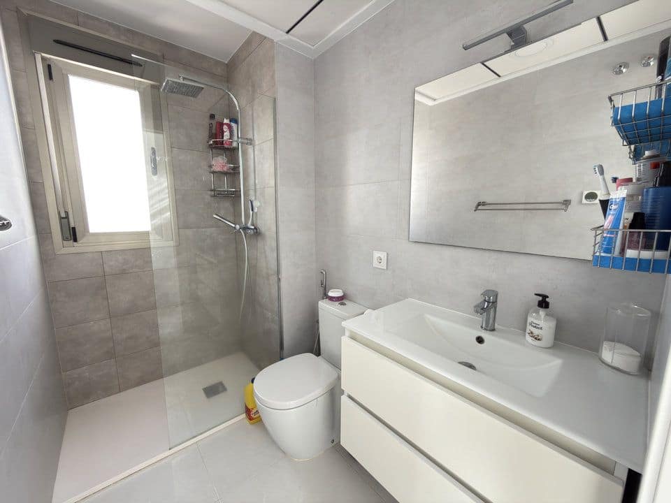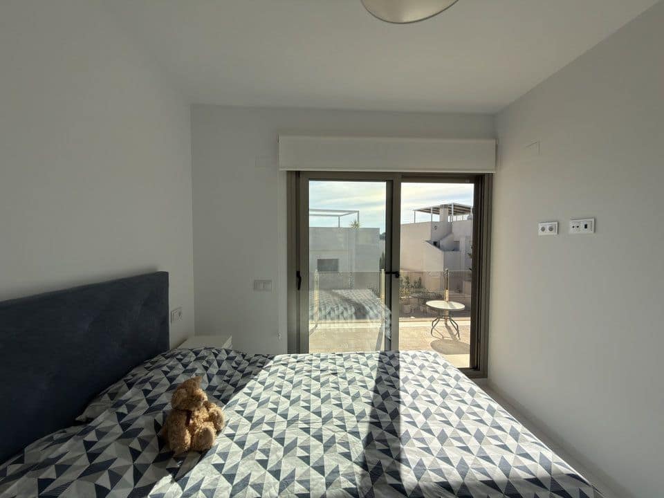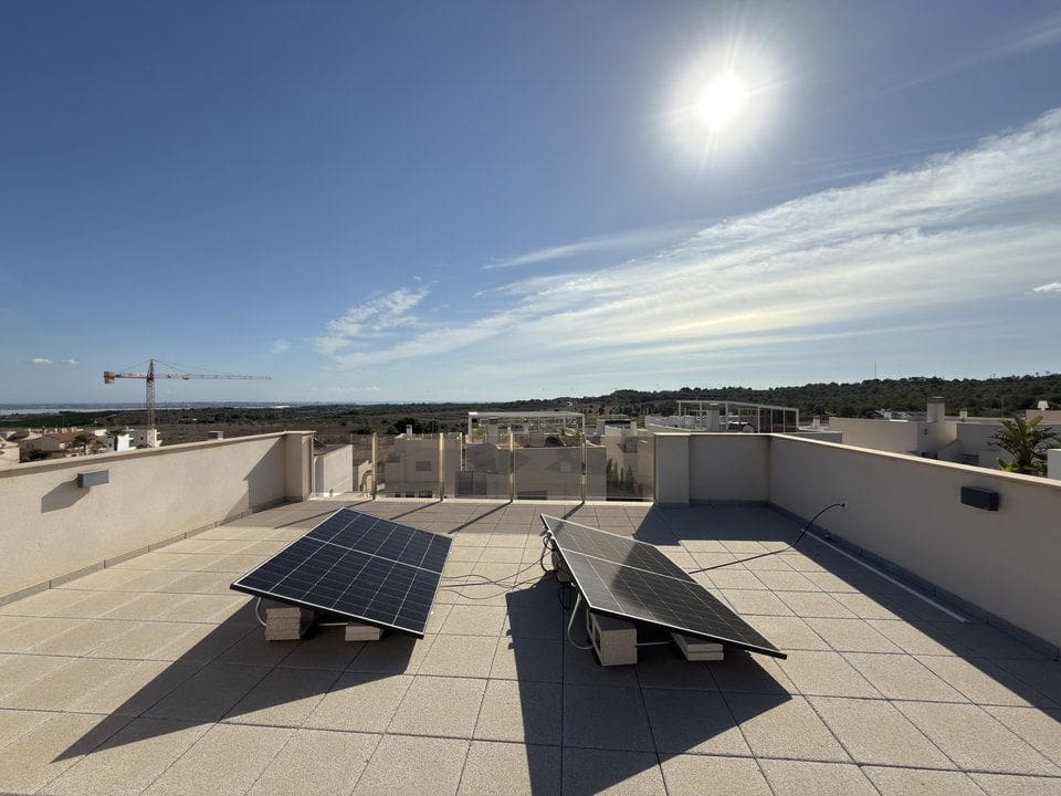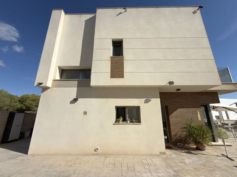 Detached modern villa for sale in San Miguel de Salinas. Set on a plot of 320m2, this property has access via an electric sliding door which in turn has a built-in pedestrian door. The South-East garden has a large 7x4m swimming pool, and plenty of free space for furniture around the pool area. There is also sitting space and an external storage void at the opposite side of the villa. The front door gives access to a spacious lounge/dining room with large windows granting access to the front swimming pool area. Also on this floor is the open-style kitchen and one double bedroom with en-suite bathroom. The first level has two double bedrooms, both of which are en-suite, with access to a front terrace. The last level is a private solarium. The property is in perfect condition and sold partly furnished. Its fully equipped with electrical goods in the kitchen and air conditioning throughout the property. Viewing recommended.