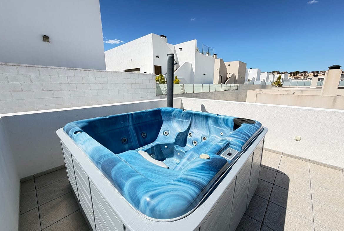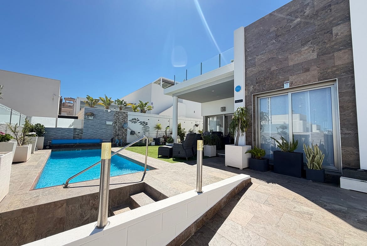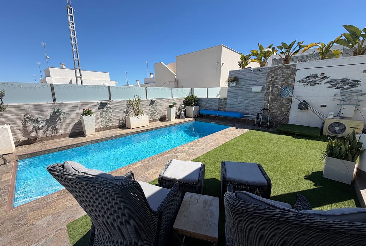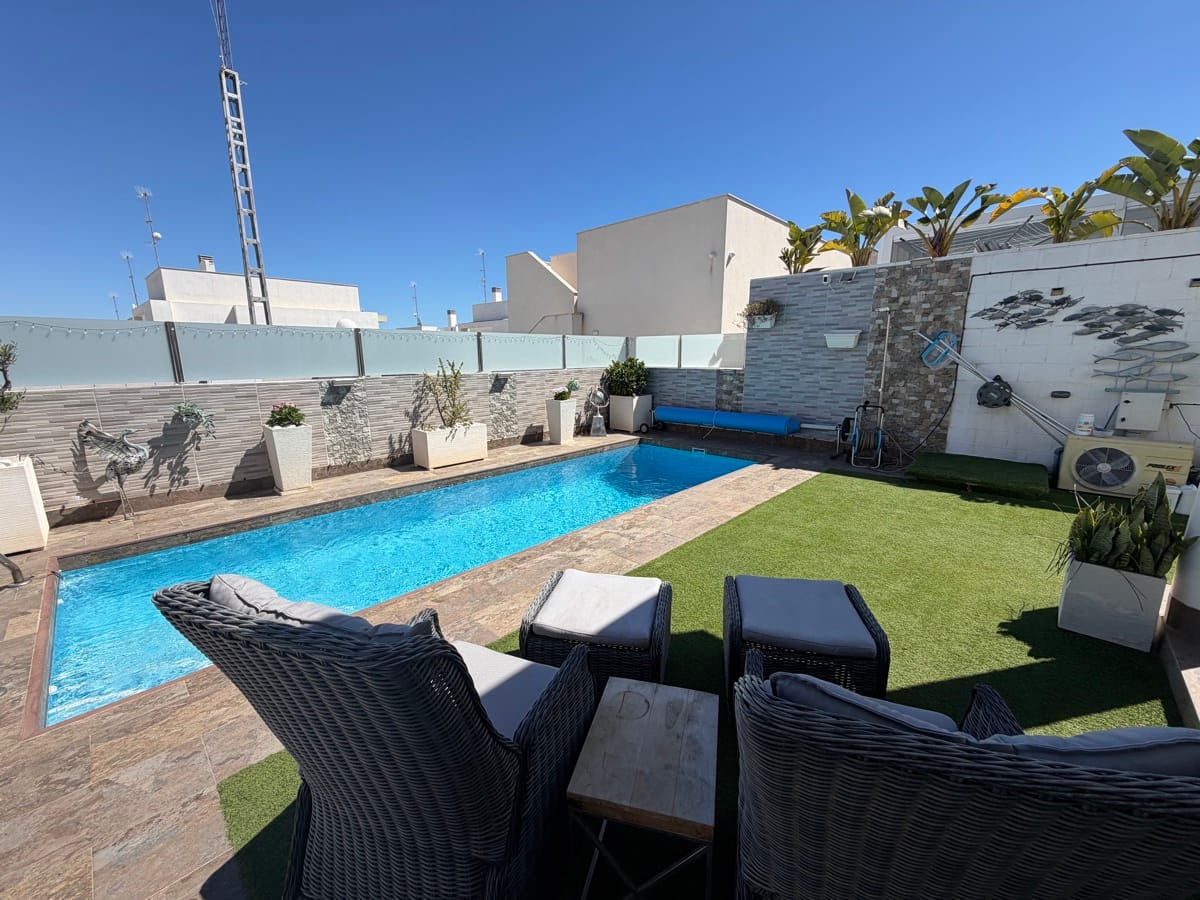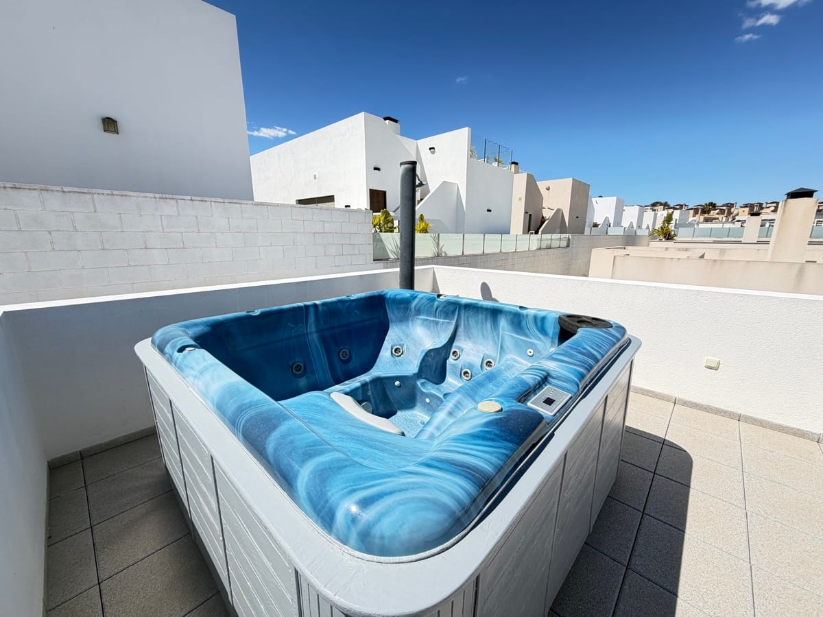 Stunning 3-Bedroom Single-Storey Villa in Pau 26, Villamartin This splendid three-bedroom, single-storey villa is ideally situated in the sought-after Pau 26 area of Villamartin. Positioned on a desirable corner plot along a private road, the property offers both privacy and generous outdoor living space. The exterior boasts a spacious garden with multiple seating areas, a private swimming pool, and off-road parking. A standout feature is the expansive rooftop solarium, complete with a jacuzzi and outdoor kitchen—perfect for entertaining while enjoying panoramic views of the surrounding area. Inside, the villa features a bright and modern open-plan living space with a large, well-appointed kitchen. There are three generously sized double bedrooms, including a master bedroom with en-suite bathroom, as well as a separate, spacious family bathroom. Offered unfurnished, this property is ready for immediate occupancy—making it an ideal choice for a permanent residence, holiday home, or investment opportunity.